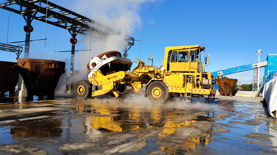 由中冶寶鋼研制的70噸鉸接式抱罐車,采用鵝頸鉸接型式,額定載重75噸,重載最高時速為每小時20公里,翻罐角度105度,最大爬坡能力8%,最小轉彎半徑9米。該車型應用專利技術10項,在國內有色冶煉市場占有率超過75%,先后榮獲中國有色工業(yè)協會、中國鋼鐵工業(yè)協會科技獎,中國施工企業(yè)管理和中國循環(huán)經濟協會專利獎等榮譽。